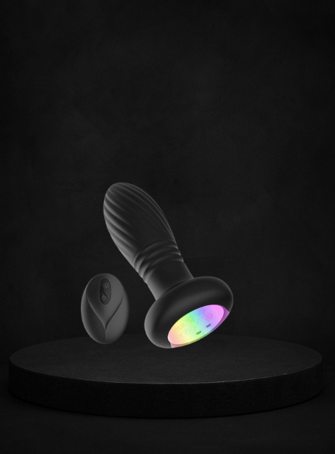 | Plug anal cônico em silicone macio com 10 vibrações, movimento vai e vem, LED e controle via controle remoto sem fio, 10 cm penetráveis. |